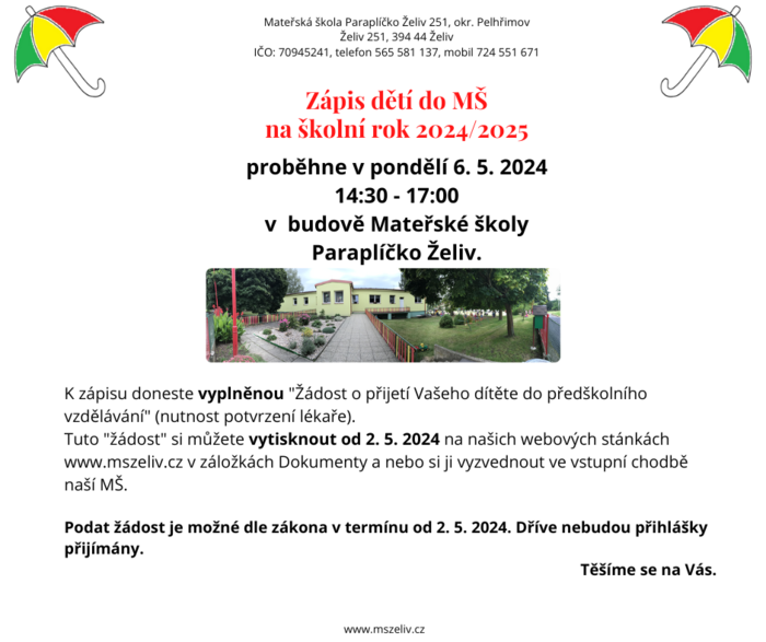 Srdečně Vás zveme na zápis dětí na nový školní rok 2024/2025, který proběhne v pondělí 6. května 2024 od 14:30 - 17:00 v budově Mateřské školy Paraplíčko Želiv 251, okr. Pelhřimov.